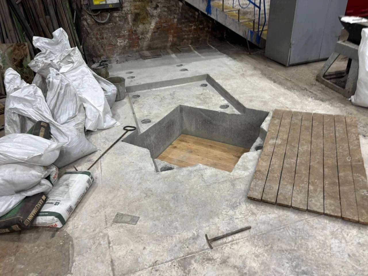 Первым делом провели демонтаж ненужных элементов и подготовили поверхность. Бетонный пол был частично снят, чтобы залить новые фундаментные плиты с анкерными болтами — именно они будут удерживать тяжелые станки. Все работы выполнялись с применением современного инструмента и соблюдением техники безопасности.